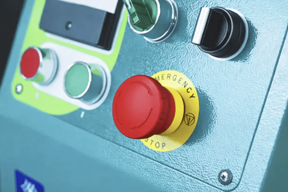 Nó cho phép người dùng dừng máy ngay lập tức trong trường hợp khẩn cấp, giúp ngăn ngừa tai nạn một cách hiệu quả. Nút bấm được đặt ở vị trí dễ thấy và dễ thao tác, đảm bảo người dùng có thể phản ứng nhanh chóng để giảm nguy cơ xảy ra sự cố.